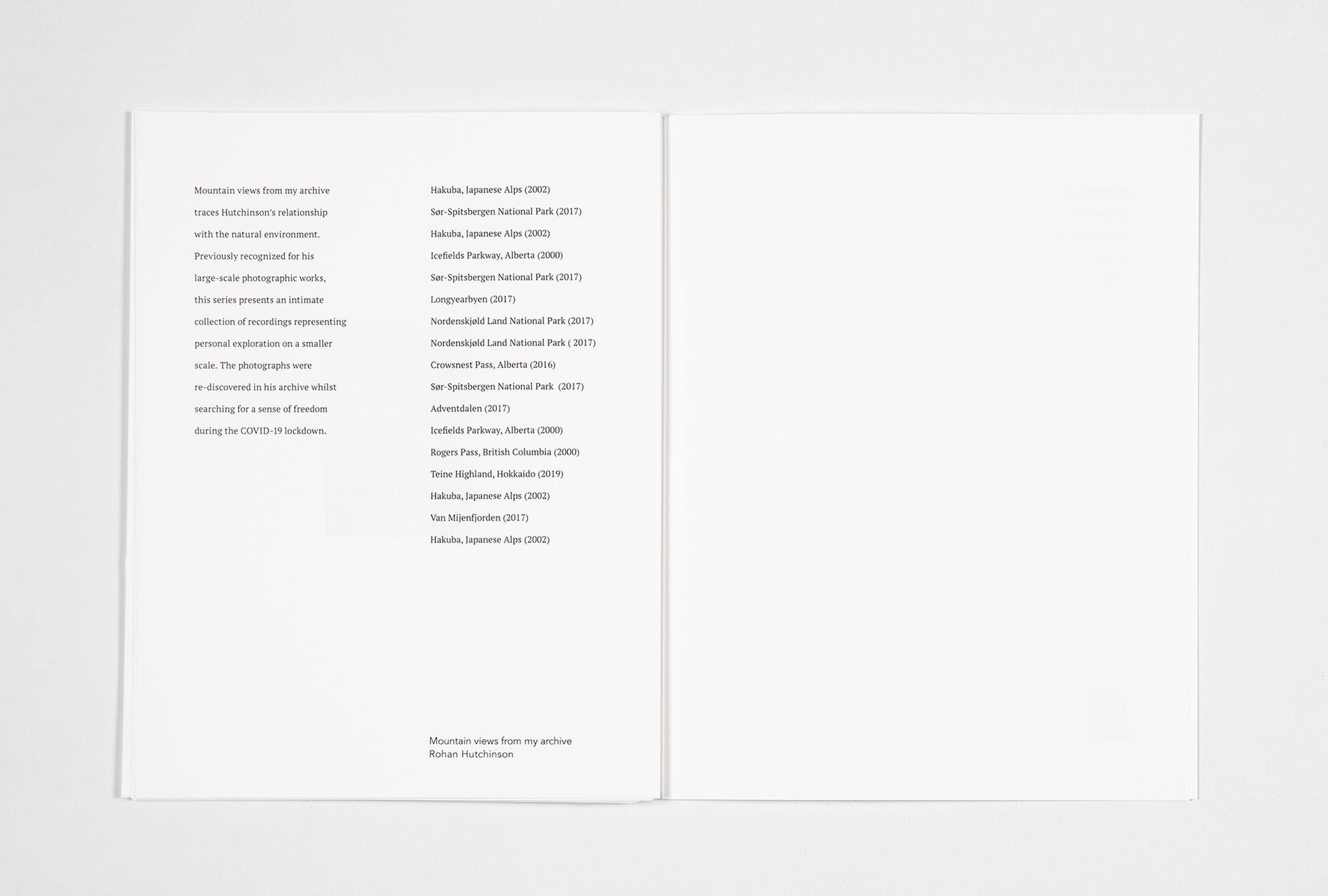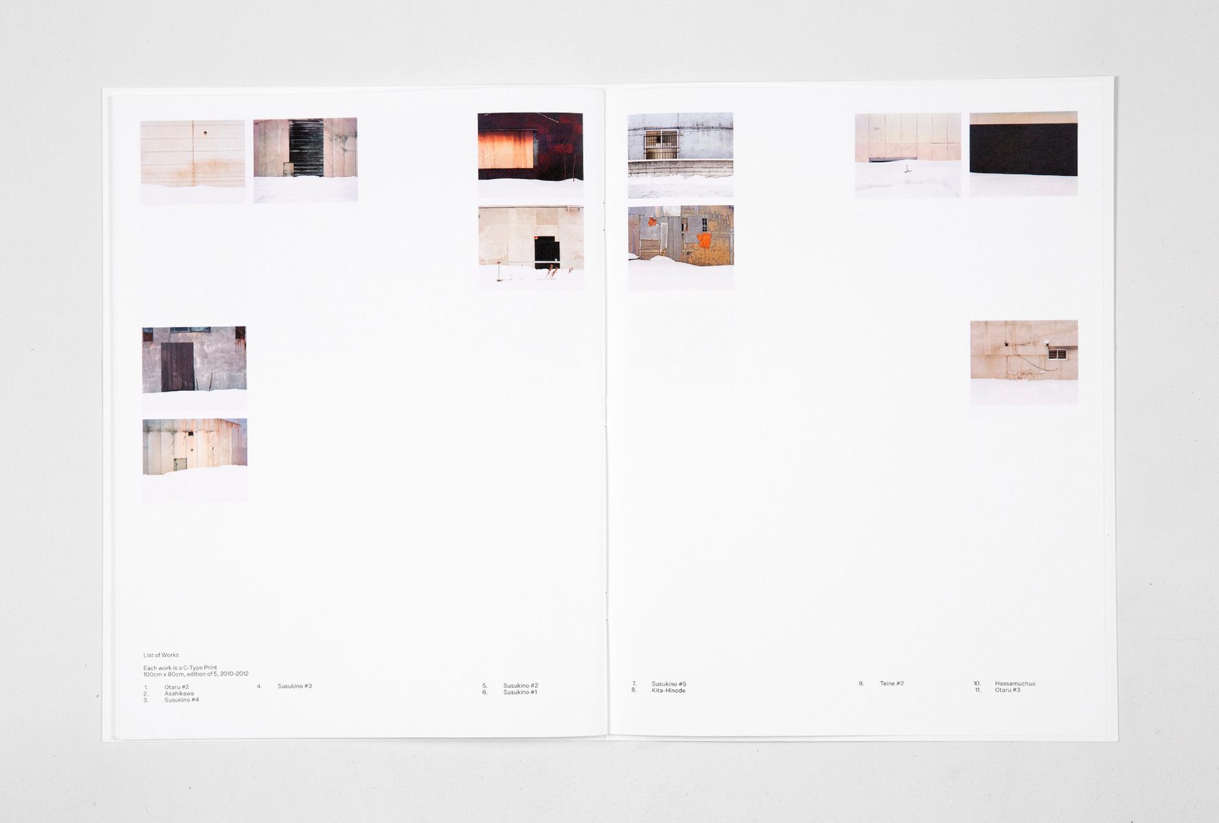 presenting an exhibition feel within the publication space. The pictorial index informs readers of the photographic works' accurate